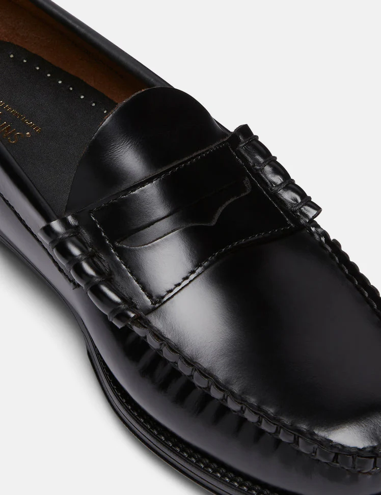 One of the original penny loafers, this shoe is crafted from black polished leather with hand-stitched seams in black waxed thread, a leather heel sock with gold foil branding, and a soft compound rubber sole with an internal polyurethane footbed for inbuilt comfort.